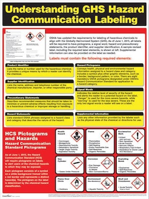FAQs on Hazard Communication Standard, GHS Labels, Safety Data Sheets ... Training on label elements must include information on the type of information the employee would expect to see on hazard communication labels, including the: Product identifier; Signal word; Pictogram; Hazard statement(s); Precautionary statement(s); and; Name, address and phone number of the chemical manufacturer, distributor, or importer. 3 Key Elements of Hazard Communication Enforcement To remain in compliance with HCS standards, you will need to uphold these three key elements: 1. Labeling Compliance OSHA compliance officers, also known as CHSOs, will check carefully for label compliance with HCS while inspecting the facilities of importers, manufacturers, or distributors of hazardous chemicals. HazCom: The GHS label requirements - Enviro.BLR.com By June 1, 2015, chemical manufacturers and importers must comply with all the requirements of the HazCom 2012 (e.g., hazard classification, GHS-compliant label and the SDS), except compliance with the GHS label requirements is optional for distributors until December 1, 2015. By that date, all shipments of chemical containers must include the ...